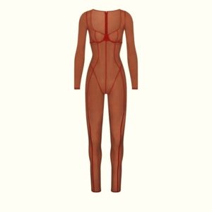 Questions? Leave a comment below!NWT SKIMS Ultra Fine Mesh Catsuit Color Chili Rust Red Plus