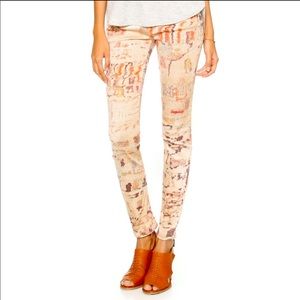 Mother ~ The Looker My life at the Bazar Jean. Gorgeous abstract pattern made of pixels across cream. patent label and cream brass buttons. 5 pocket styling. Single button closure and zip fly.