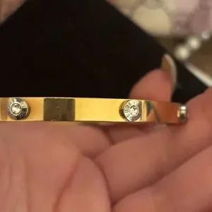 Excellent used condition Henri Bendel gold bangle bracelet with silver crystals surrounded by the Henri Bendel logo. The bracelet is 8 inches in length. Henri Bendel‘s name is on the inside of the bracelet engraved. This is a beautiful bracelet that is very modern and on trend. It is perfect for stacking with other bracelets or can be worn on its own as a statement piece. it goes with everything because it has silver and gold on it. Please contact me with any questions.