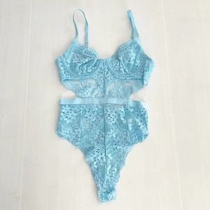 NEW Forever 21 Sky Blue Sheer Lace Lingerie Bodysuit Thong