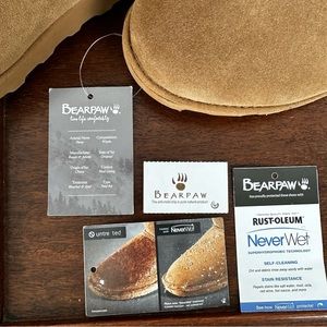 BearPaw’s motto is live life comfortably. And if these brand new Tonya model boots were a half a size larger, I would keep them. They are protected by Rust-oleum. Have an anti-mold chip with Me never wet, super hydrophobic technology that is self cleaning as dirt and debris rinse away easily with water. They are stain resistant from saltwater, mud, cola, red wine, hot sauce and more. Cow-suede upper, wool blend lining, sheeps wool footbed, blown rubber outsole. Includes removable 5-strand decorative fringe. Originally sold at $79.95, they are out of stock everywhere. Size 9. From a pet-free home.