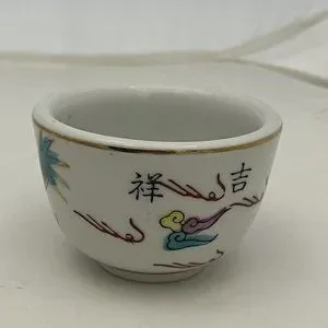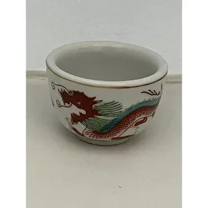 This is a really cool small restaurant ware sake cup bowl featuring a painted dragon design. It is made in Japan and possibly vintage. Gold trim and it measures approximately 2 inches tall and just over 2 inches wide. Beautiful design and great replacement cup.