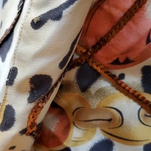 Escada vintage, made in West Germany, silk button up blouse. Multi color print with black animal print spots, golden chains and red gems. Sequin scroll in a copper color.