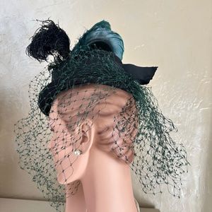 This is a magnificent example of the fabulous millinery fashions of the 1940s'! This is a black felt hat made in a top hat style. The crown is medium size and tubular in shape. It has a short brim. There is a wide black grosgrain band surrounding the crown as well as a full green veil. There is an elastic band attached to the inside in order to keep the hat in a tilted position. The showstopper curled feathers that project from one side. There are teal colored feathers, as well as black ostrich feathers. Simply stunning!