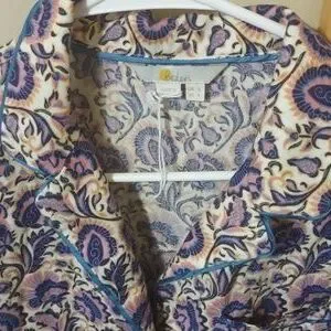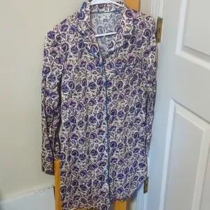 New without tags. Vibrant Purple Yellow and blue tones. Very nice satin teal blue trim. 100% cotton with light flannel feeling. UK 8/ US 4. Shirt style nightgown.