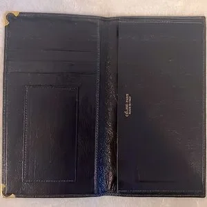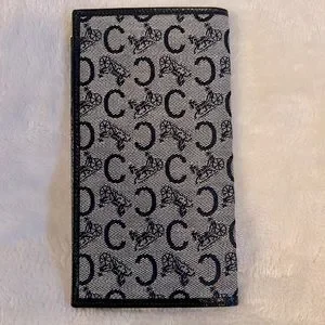 This beautiful gray and navy blue wallet is in great condition. It is nice and slim for any medium to large bag. Inside is just as clean as the outside.