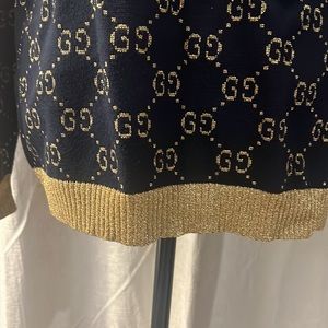 Gucci intarsia navy blue cardigan, gold metallic logo, thread, and trim