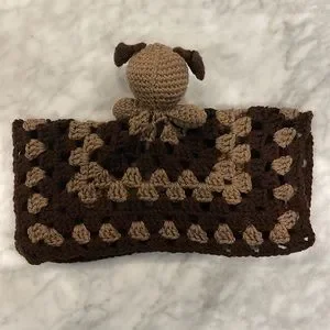 Brown security blanket with a puppy design. Stuffed puppy head attached to a handkerchief-style crochet blanket. Can be used for snuggling, as a travel buddy or as nursery decor. NWOT