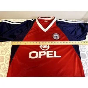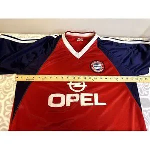 Bayern Munich 1999/2001 Home Football Shirt Jersey Adidas Opel. I think this is a men's size Large or XL, see the measurement from pit to pit (44"). No damage or other stains that I can find.