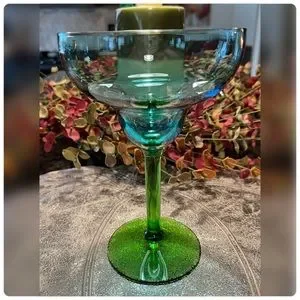 Add some color to your barware collection with this stunning pair of hand blown margarita glasses. The beautiful blue and green hues blend seamlessly together, creating a unique and eye-catching design that's sure to impress. Crafted with care, these glasses feature intricate details and a high-quality finish that exudes elegance.