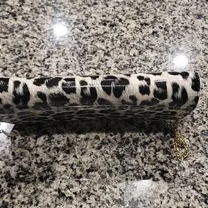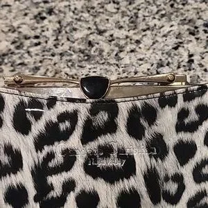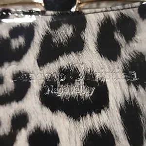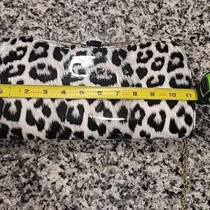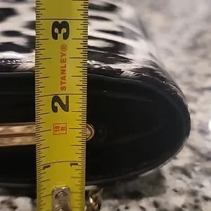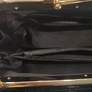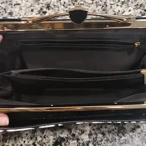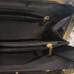 This bag is made of vintage upholstery vinyl, by Candace Christian Napa Valley. Interior has a center zip pouch and a zip pochet on the back, and two open compartments. Gold tone hardware with what looks like onyx in the center top of the clasp. 46" Goldtone chain is removable. 11" x 5.75" x 2.25" approx. If you're into pinup girl style or vintage bags, you'll love this! Like new condition; clean, no scratches, tears, stains.