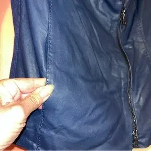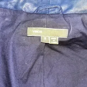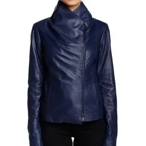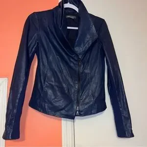 Vince Lambskin Leather Scuba Draped Moto Jacket. Whisper of a Moto Jacket; Classic with an edge. Oversized Collar… stands Up when fully zipped, and lays flat when open. Off Center Double Zipper Front Closure. Two front/hip pockets. Fully Lined. Topstitch details. Ribbed wool Knit Panel, up the body and the inside of the arms… allowing for some give. THE SOFTEST; buttery Leather. Beautiful shade of blue.