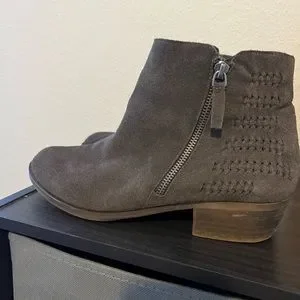 1 1/2” heel, Grey/Taupe Suede. Super cute, just too big.