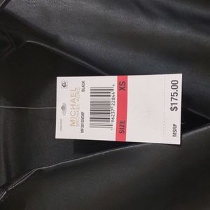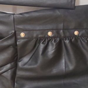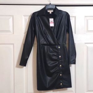 This is a beautiful faux leather dress. This dress features gold tone buttons on the front.. Surplica neck with pointed collar. These pictures fo not show justice. Dress it up or down. Very nice!!