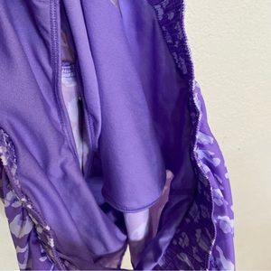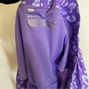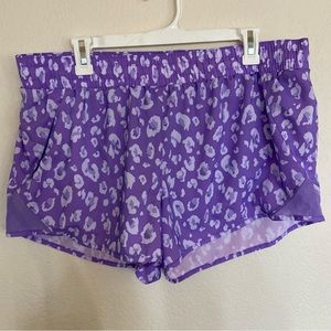 All in Motion purple cheetah print shorts for running, has built in underwear and right zipper pocket.