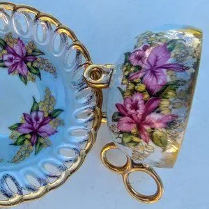 fine china. Cup has 3 claw feet & 2 hole handles