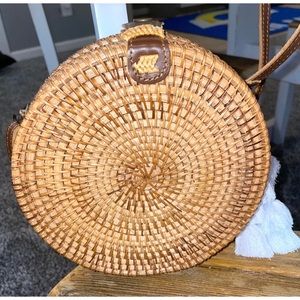 Wicker Purse, Boho Bag - Round Rattan Crossbody Beach Bags. Has tropical fabric print inside, and white tassel charm. Strap is detachable. In excellent condition