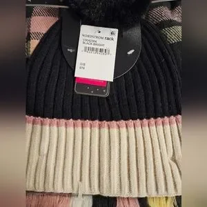Scarf: 100% acrylic; beanie: 50% rayon, 26% polyester, 24% nylon with 100% polyester faux-fur trim