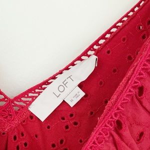 Beautiful and bright top from Loft size medium. Vneck neckline with eyelet ruffle detail, lovely bright red color, machine washable fabric. Excellent used condition!
