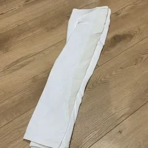 Lululemon white mesh floral panels with velvet trim on panels. Crop Capri length. I feel like there are a couple teeny tiny dot marks on the inside back of right leg. I showed a zoomed in picture to show these. These were worn one time indoors standing up and then washed on gentle cycle and hung to dry. I cut out the paper tag because it was showing bulky through the fabric.
