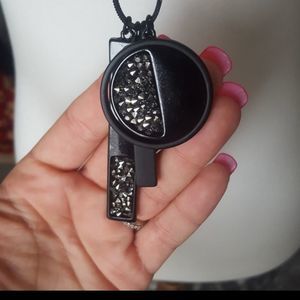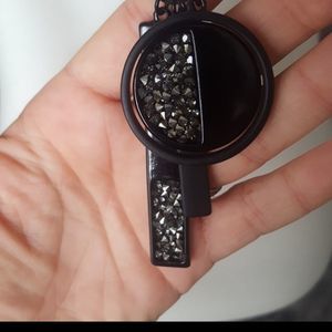 Black both shiny and matte backround with varied silver & charcoal gray stones. 16 inch chain 2 3/4 long pendant
