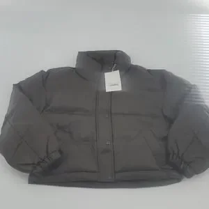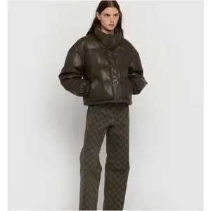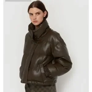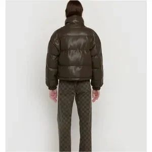 This puffer jacket is made from a buttery soft vegan leather with a button front and drawcord hems. It has side pockets for function. Wear yours with checkered pants and combat boots.