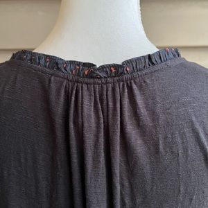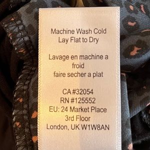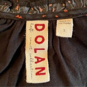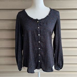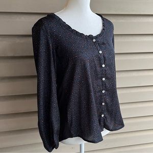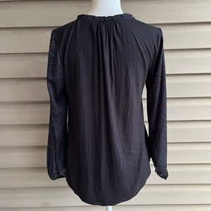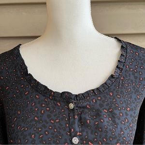 This is a long sleeved Marilyn blouse from Anthro’s Dolan Left Coast, ladies size Small. The woven fabric in front, 100% polyester, is dark navy blue with a leopard print in black and dark peach. The knit back, 96% rayon/4% spandex, is black. Features a scooped neckline with small ruffle at the edges, buttons down the front, slightly rounded hemline, and full sleeves with elastic at the wrists. Easy machine wash care and pairs well with leggings or your favorite jeans!