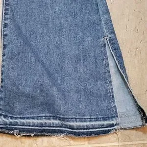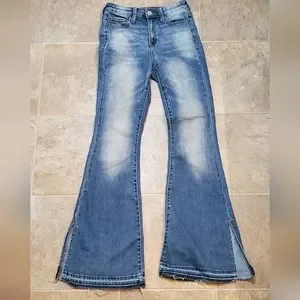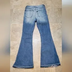 Very soft denim by SO in size 3 or 26. It's a stretchy blend of 61%cotton/34%recycled poly/1%spandex/4%other. Measures about 11" High Rise and 30" inseam. The flare has a slit leg and raw hem. Fun style in like new condition, worn once.