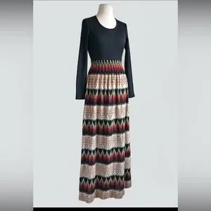 Vintage 70s Black & Woven Bohemian Maxi Dress