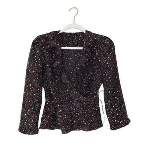 Madewell Silk Ruffle-Hem Wrap Top in Starry Night Black Red White Blue Size XXS