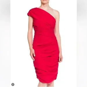 This dress is great condition size 2 , I believe it’s called raspberry color but it looks more red to me . I have my red nail next to it for reference !!