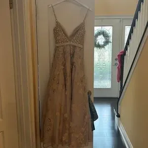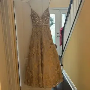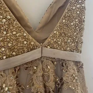 Stunning gold sequins dress. Worn once as a bridesmaid. Sequins all over top. Very excellent quality. Many layers for skirt.