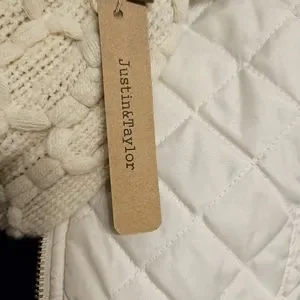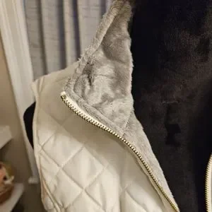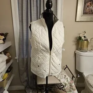 Winter white vest with goldtone button accents at pockets. Zipper is goldtone too. Lightweight vest with quilted pattern design. Lining is made of faux fur; color taupe. Washable.m