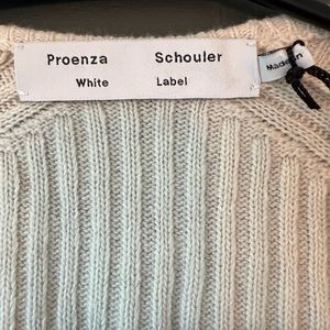 Proenza Schouler White Label Cream Scoop Neck Sweater. Plaited Rib Scoop Neck Sweater is woven in off-white and cream yarns that create a two-tone effect. Ribbed-knit construction. Scoop neck. Long sleeves