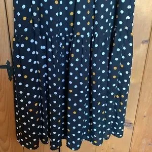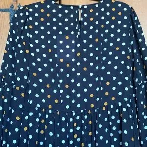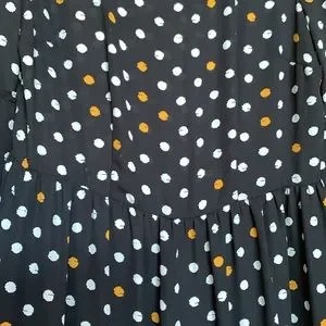 Long sleeves. Ruffled bottom. Orange and White dotted pattern.