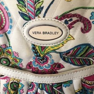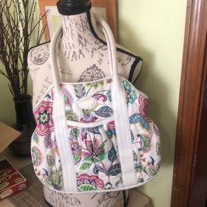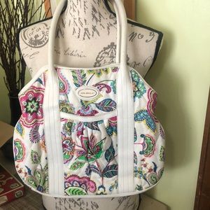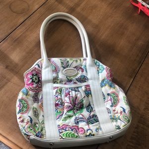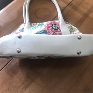 White trim with floral print shoulder bag. Gently used has a couple of scuffs. No holes or tears in fabric.