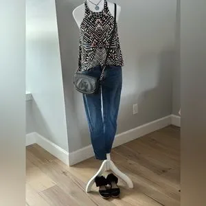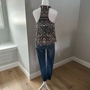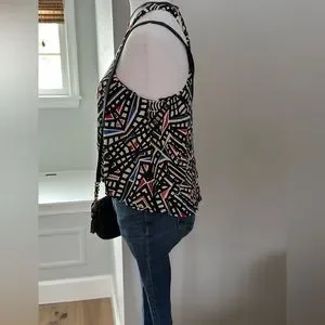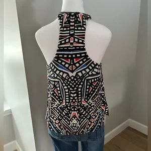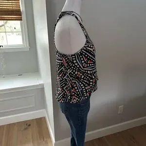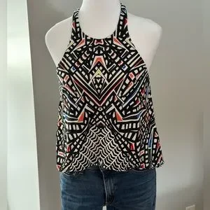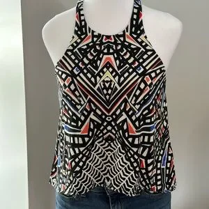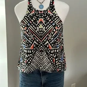 Tart top with built in shelf bra. Stretchy material with bright colors. Shorter in the front. Excellent preowned condition. Funky fun top!