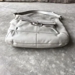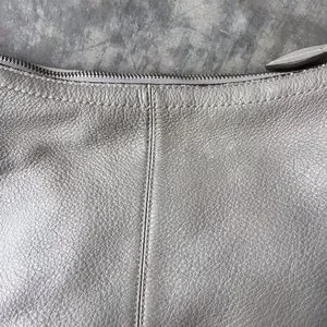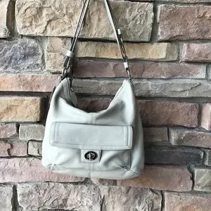 Coach soft gray pebble leather shoulder strap purse. Silver tone hardware. Hangtag. Front pocket 5” x 8” with turn lock. Top zip closure. Interior is lined with pink fabric and has 1 zip pocket and 2 slip pockets.