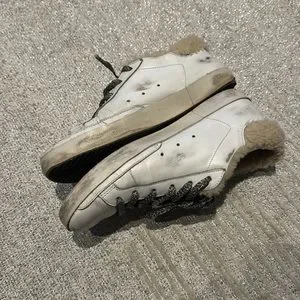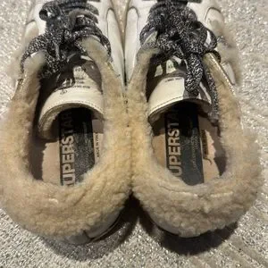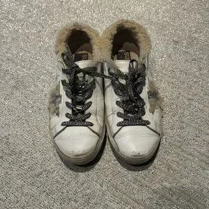 Golden Goose Super-Star LTD with shearling lining and silver glitter star; good condition but the heels have considerable wear. Please also note that laces are frayed at the ends. Size 38