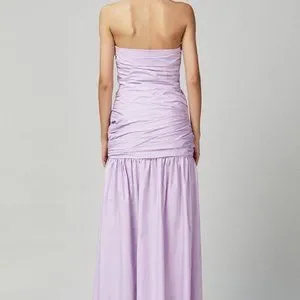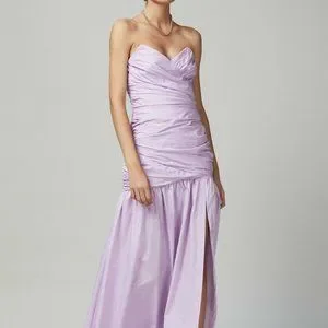 Strapless sweetheart neckline. Midi length. Ruched drop waist bodice. Gathered skirt with front split. Invisible zipper at side seam.