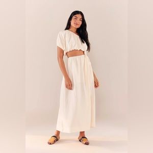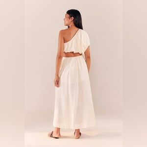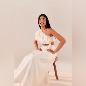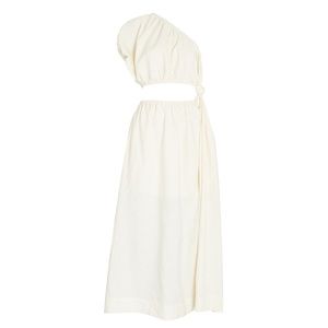 Knotted along a cut-out waist, Farm Rio's maxi dress is tailored for a sleek one-shoulder silhouette in their airy linen-blend. Elasticized shoulder, cuff and waist.