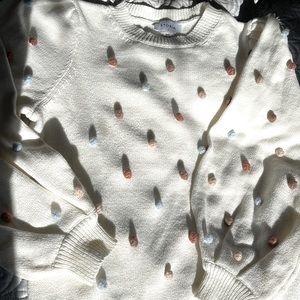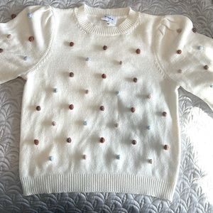 Excellent condition worn 2x no pilling or stains. Cute puff sleeve and dusty pink, dark rose, and blue puff balls on a creamy winter white sweater that fits not snug and not baggy not cropped .