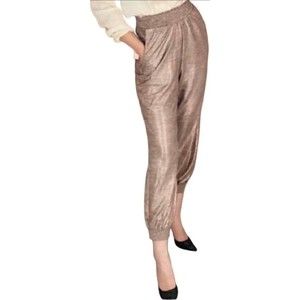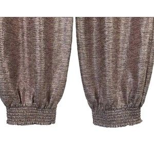 Get ready to shine in these Anthropologie Melora Joggers! These pants feature a beautiful metallic rose gold color that is perfect for any occasion, whether it be casual, work, or a party. The relaxed fit and pleated front create a comfortable and stylish look, while the tapered leg style adds a touch of sophistication.