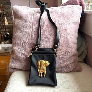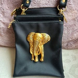 Black Crossbody Bag with a Gold Elephant and gold zipper hardware