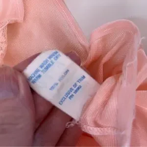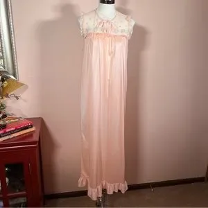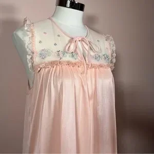 Adorable cottagecore night gown with sweet pastel embroidery of mint green, baby blue and sweet pinks on sheer netting. Retro Design with a charming pussybow neckline, tiny lace fluttering at shoulders and a long gathered hem with a flirty ruffle. Pastel peach on a 100% nylon with a lovely sheen.