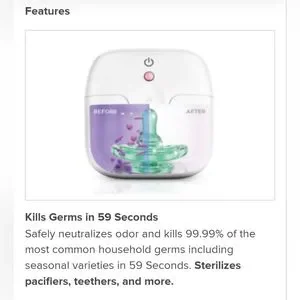Safely neutralizes odor and kills 99.99% of the most common household germs including seasonal varieties in 59 Seconds. Sterilizes pacifiers, teethers, and more.