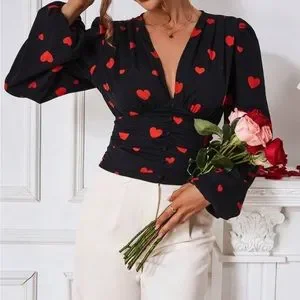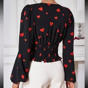 Plunge V-Neck Pleated Smocked Waist Button Lantern Sleeve Top Blouse Black