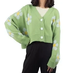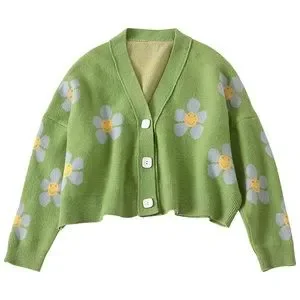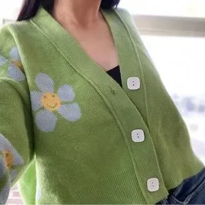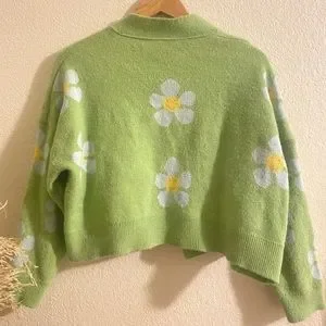 Adorable knit green cardigan with smiley daisies! No flaws, soft and has a slight stretch to the material.