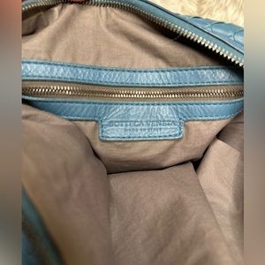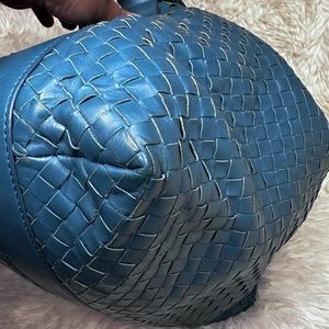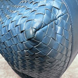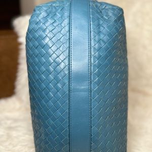 This Bottega Veneta Pyramid Intrecciato Nappa Shoulder Bag is the perfect accessory for any fashion-conscious woman. Made in Italy, it features a stunning blue exterior in high-quality leather with a zip closure and blue leather handle.