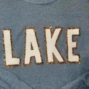 The word LAKE on front in white, surrounded by tiny circle embellishments in a copper color. These embellishments really make the white lettering stand out.